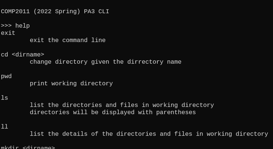 If you don't modify main.cpp, you can compile and run the program, it will start the command line for you. You can type help and "enter", then it will show you all the commands and their usages. Please also check the zoom recording of PA3 introduction (held on 22th) if you still have questions.
