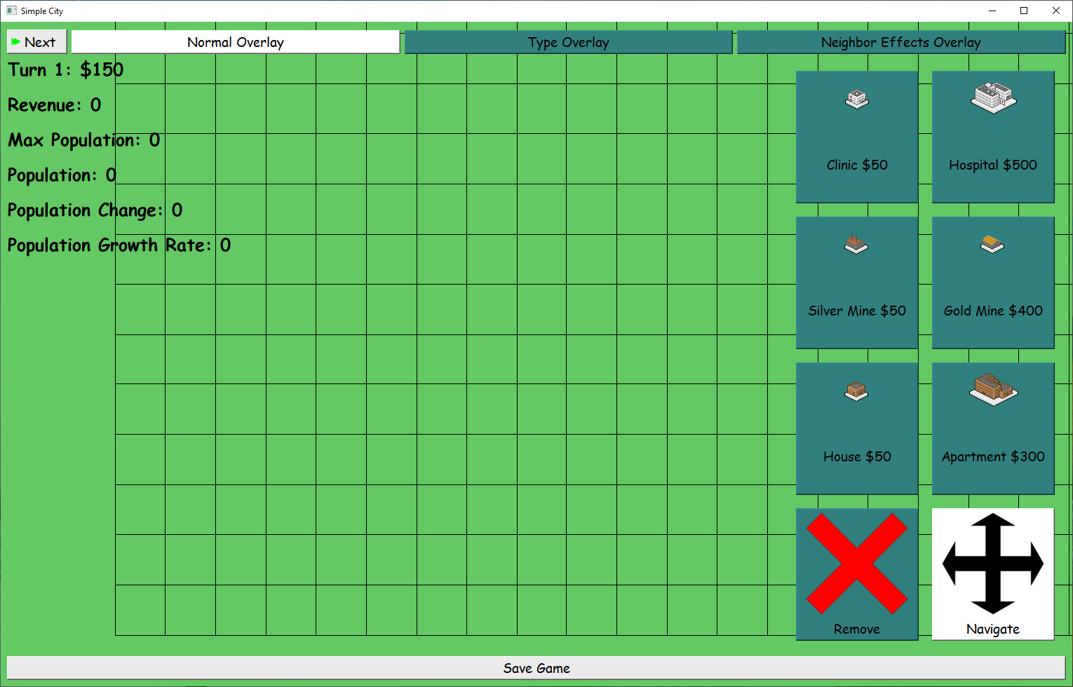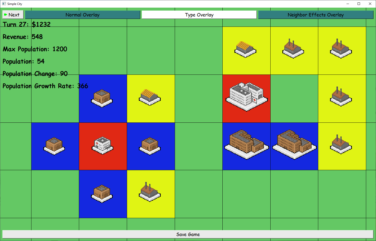 By default, "Normal Overlay" is chosen. When "Type Overlay" is chosen, the buildings are highlighted according to their types (Health, Revenue or Residential):