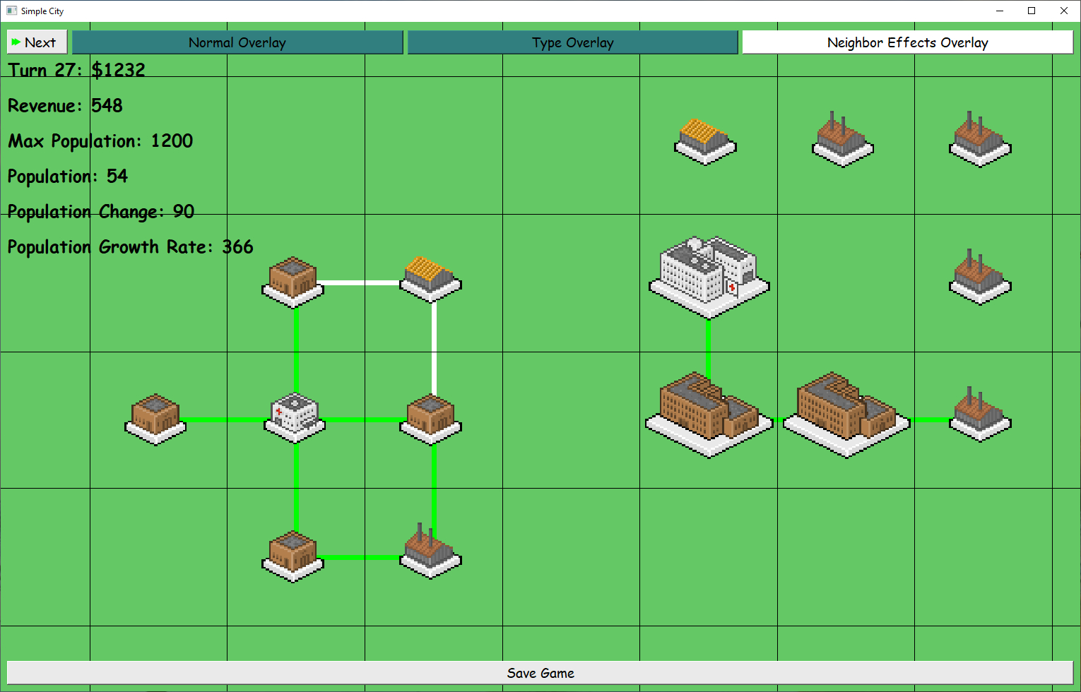 When "Neighbor Effects Overlay" is chosen, lines are shown to indicate neighboring effects between buildings: