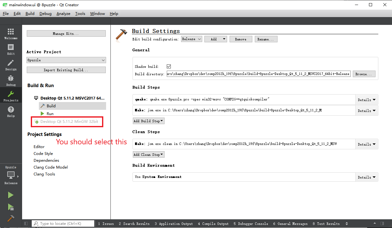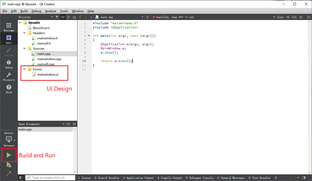 Use QtCreator to open 8puzzle.pro. If QtCreator complains about there are no