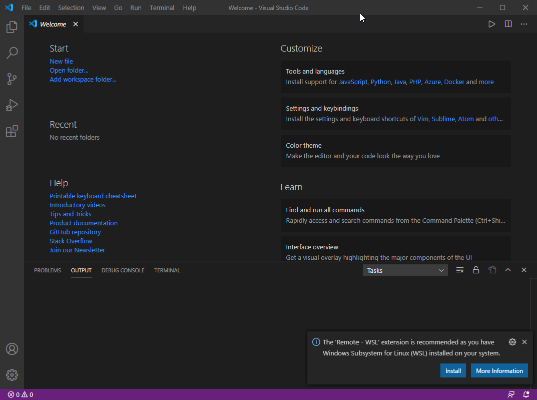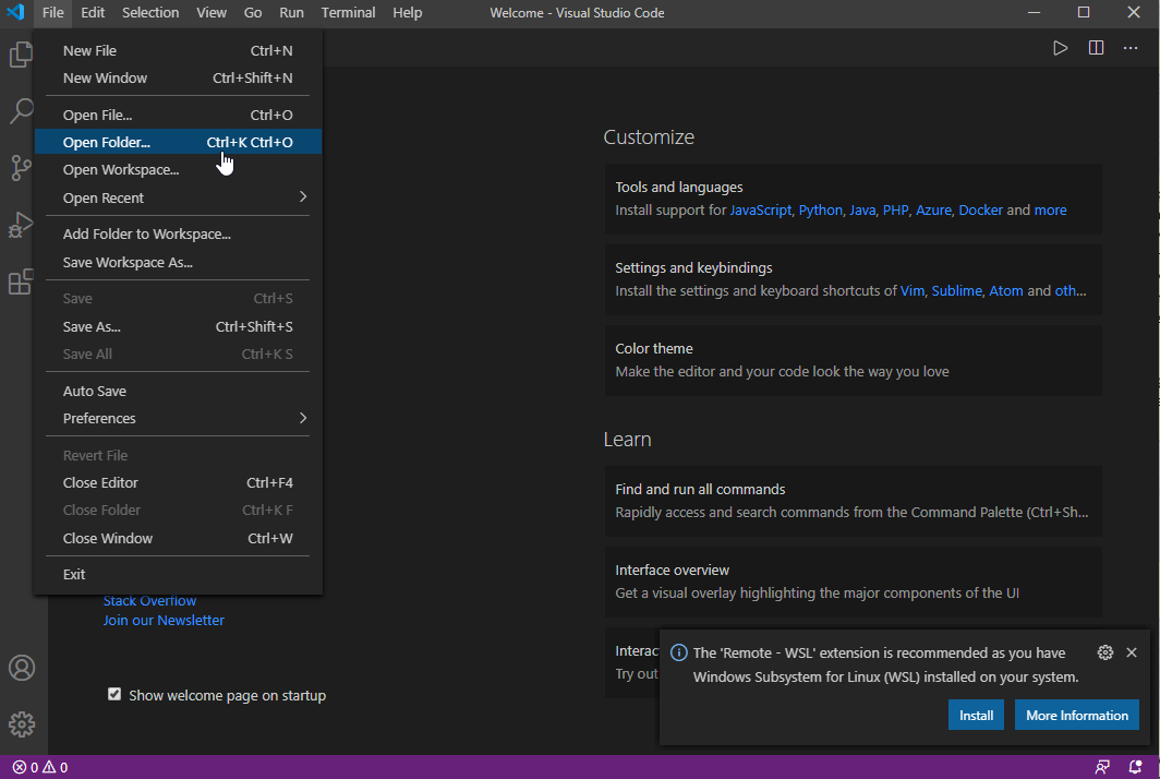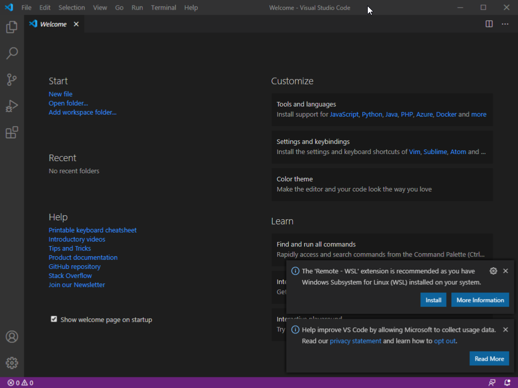 Let's launch VS Code first. It probably is on your Desktop if you have followed our installation procedures. If some popups appear on the bottom-right corner of VS Code, just close them with the close buttons just above them.