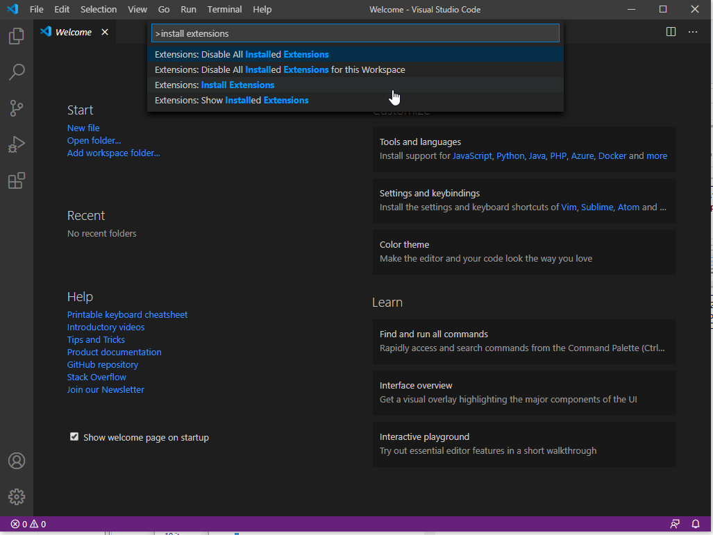From the "View" menu, choose "Command palette" (you can also press F1 on your keyboard if you are using Windows). The command palette, in which you can search for and run various commands, appears. Search for and run "Extensions: Install Extensions".