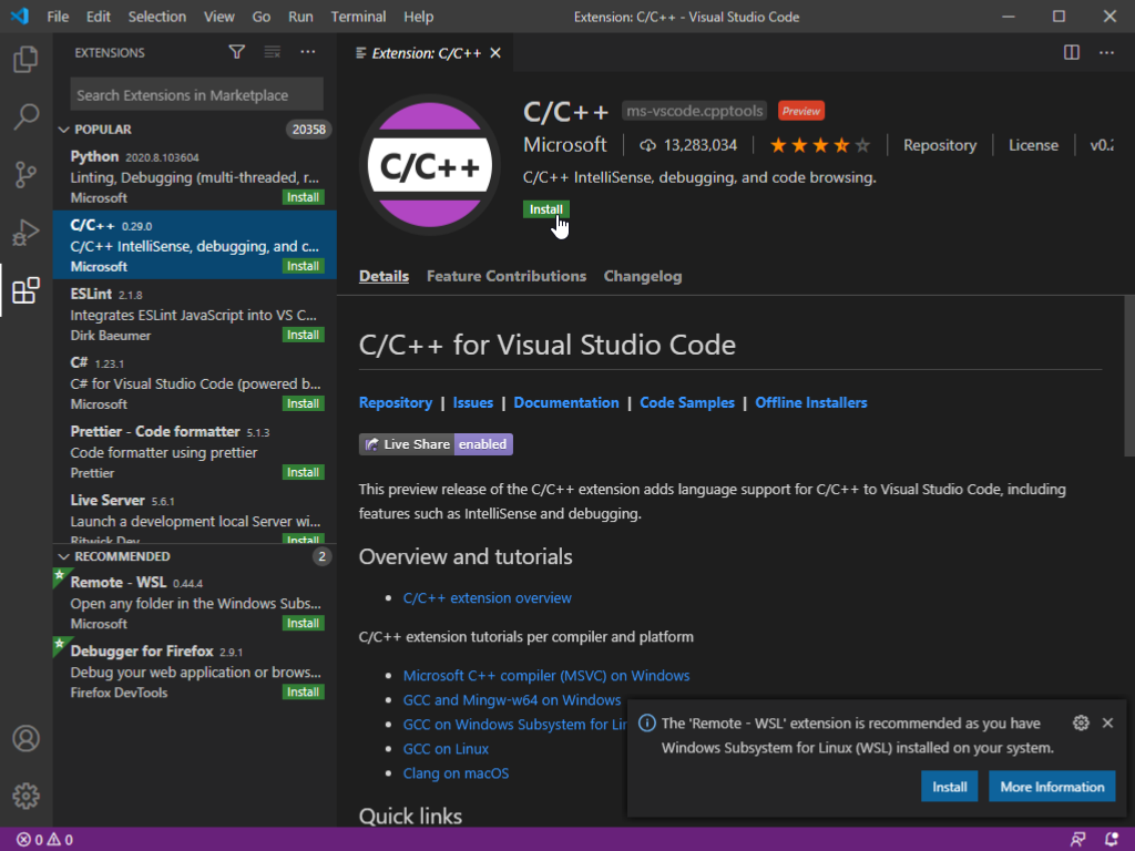 On the extensions sidebar on the left, search for the extension "C/C++". Click "Install" to install it.