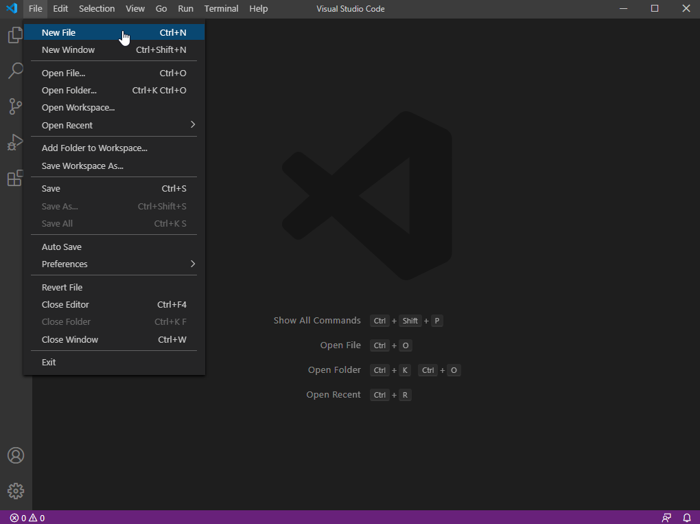 From the "File" menu, choose "New File", or simply use the keyboard hotkey Ctrl+N on Windows. Tips: you can also find it in the command palette (press F1 key on Windows and type "New File"; on MacOS, the command palette hotkey is different, you may find it from the "View" menu)