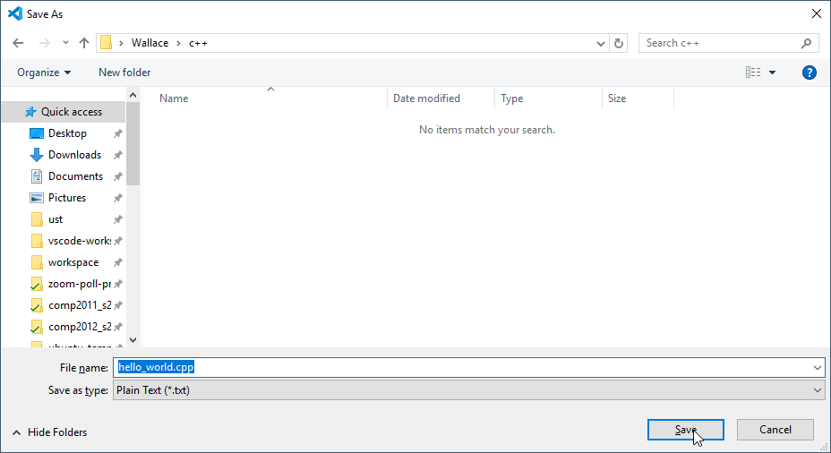 Choose a location, give it a proper name, and click "Save". Note: make sure the name is something.cpp which ends with .cpp to indicate that is a C++ source file.