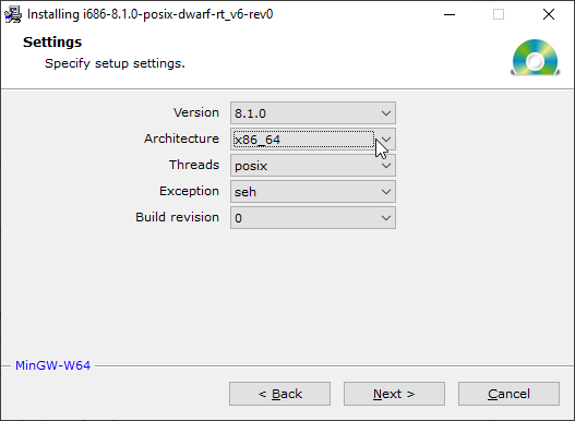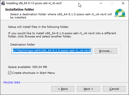 Note the Destination folder. For us, it is "C:\Program Files\mingw32-w64\x86_64-8.1.0-posix-seh-rt_v6-rev0" but yours may be slightly different due to version difference. Copy down your destination path now. We will need it later.