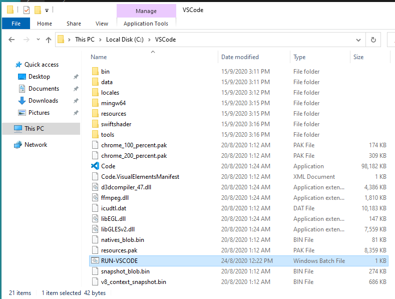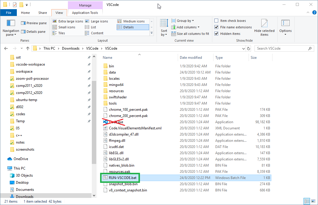 3. Very important! Run the RUN-VSCODE.bat, NOT the Code.exe. Otherwise, the compiler won't work. See the screenshot below. It may only show "RUN-VSCODE" on your computer, that is fine.