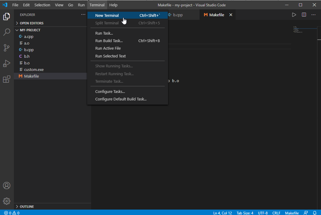 To run custom commands, such as make for using the Makefile utility for separate compilation (covered at the beginning of COMP2012), click "New Terminal" from the "Terminal" menu.