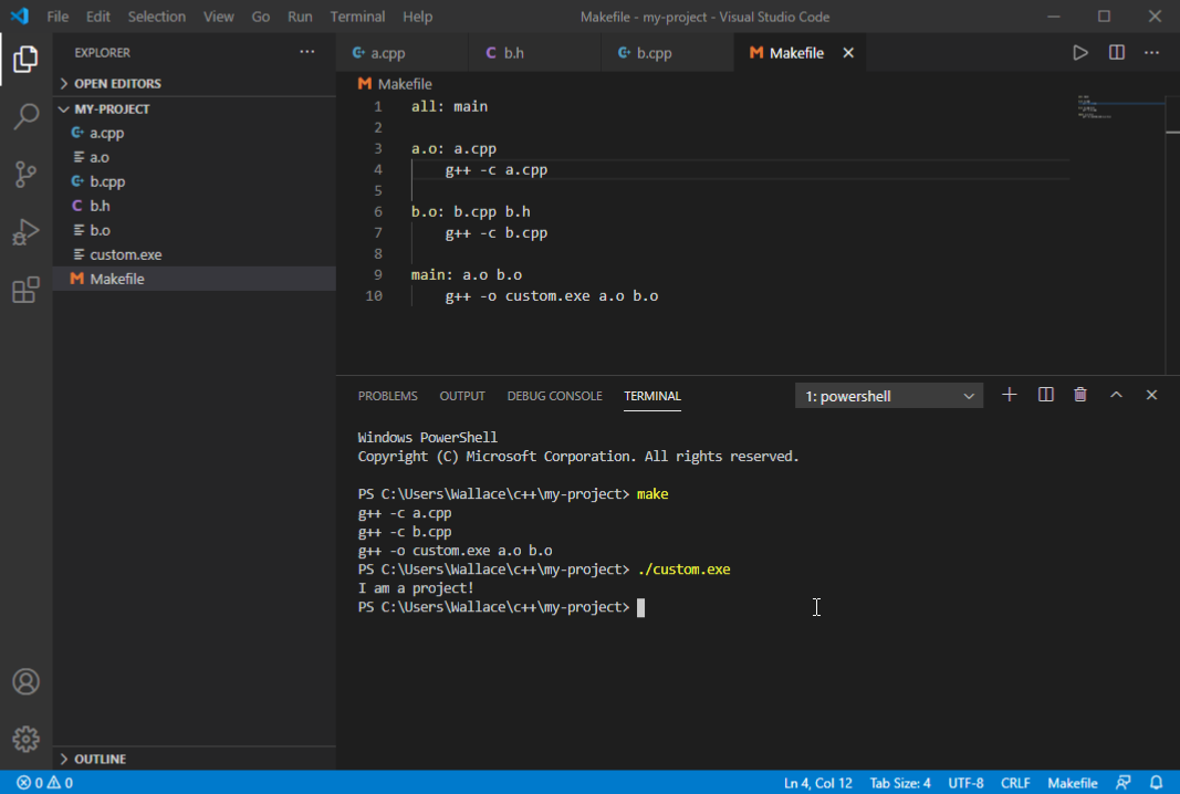 Creating a project and using the terminal for custom compilation command
