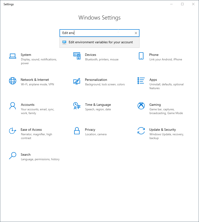 On the "Settings" dialog, type and search for "Edit environment variables for your account".