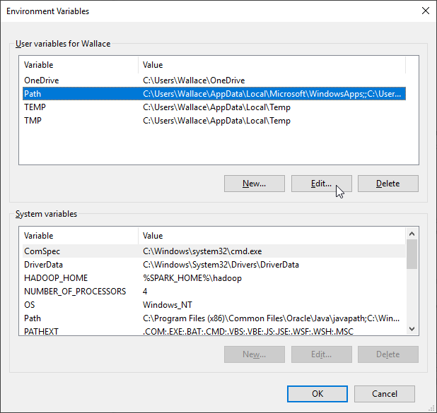 On the dialog, choose the "Path" user variable as shown below, and click "Edit..."