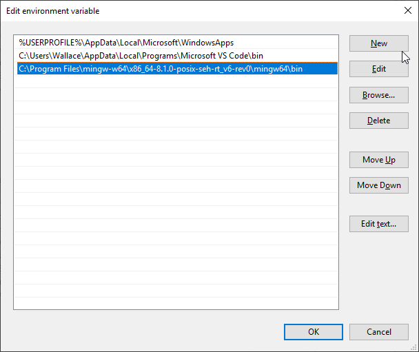 On the new dialog, Click "New" to add a new path, the path should be what you noted down earlier appended with \mingw64\bin