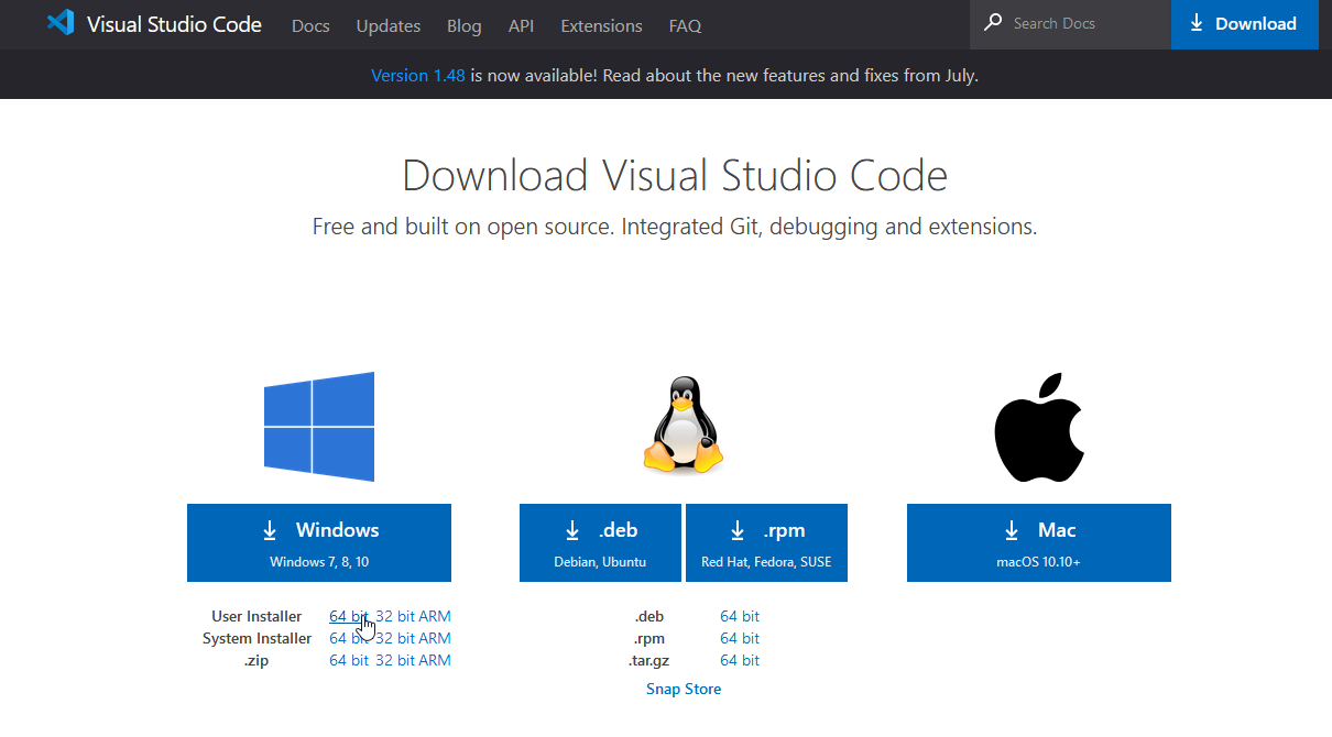 Go to https://code.visualstudio.com/download and download the 64 bit User Installer for Windows