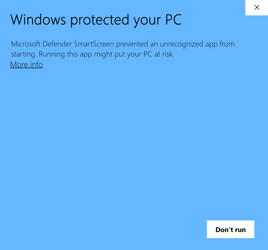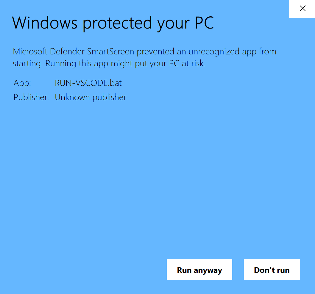 Note: When you first run the RUN-VSCODE.bat, you may see a warning as follows. Just click "More info" and "Run anyway".
